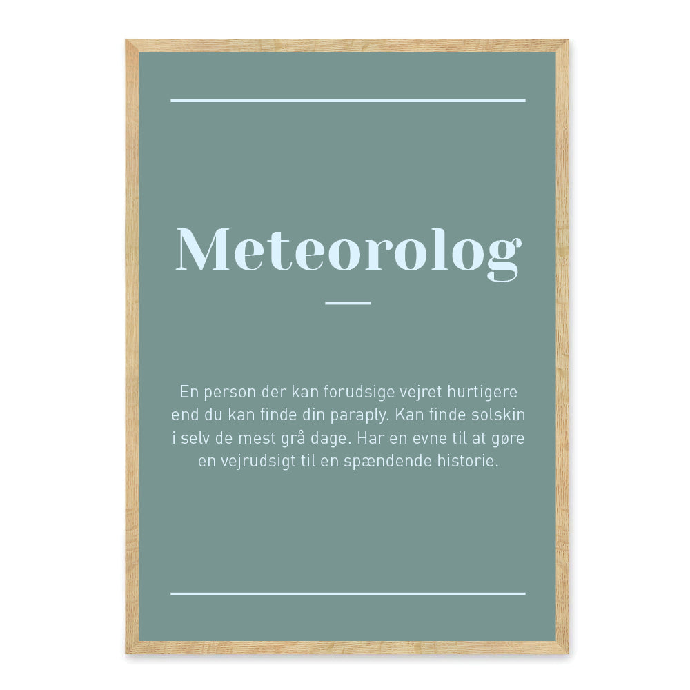 En fin plakat til en Meteorolog. Plakaten er en del af en serie af plakater inden for job og uddannelse, og har skrevet nogen sjove sætninger om de forskellige erhverv. Find plakaten til den nyuddannede eller blot til at vise jeres jobs og personlighed i familien.