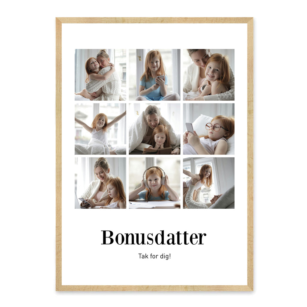 Et kærligt og personligt minde til din bonusdatter, der fejrer det særlige bånd mellem jer. Denne plakat fanger glæde, omsorg og de små øjeblikke, der gør jeres relation unik. Plakaten kan tilpasses med dine egne 6 eller 9 billeder, en personlig overskrift og tekst, som fortæller hendes historie og de minder, I skaber sammen.
