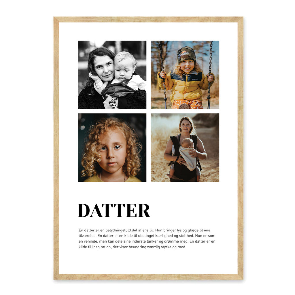 Fejr kærligheden og det særlige bånd til din datter med denne smukke plakat. Gør den personlig med egne billeder og tekst, så den afspejler minder, nærvær og de gode stunder, I deler sammen.