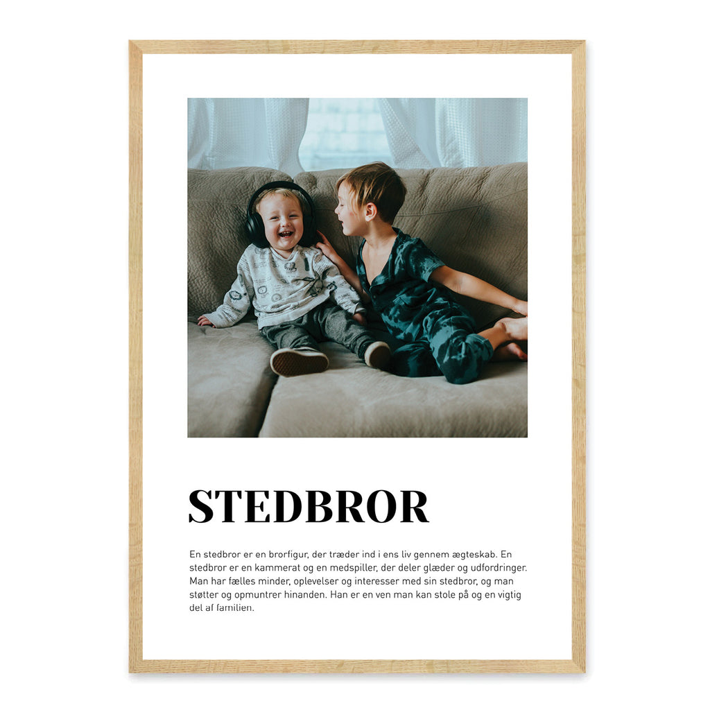 Gør plakaten personlig ved at vælge en færdig tekst eller skrive din egen, og upload ét eller flere billeder, der fortæller jeres historie. En oplagt gaveidé til fødselsdag, jul eller som en varm og personlig overraskelse, der viser, hvor meget din stedbror betyder for dig. Det stilrene, nordiske design gør den til et tidløst minde, der kan pryde ethvert hjem.