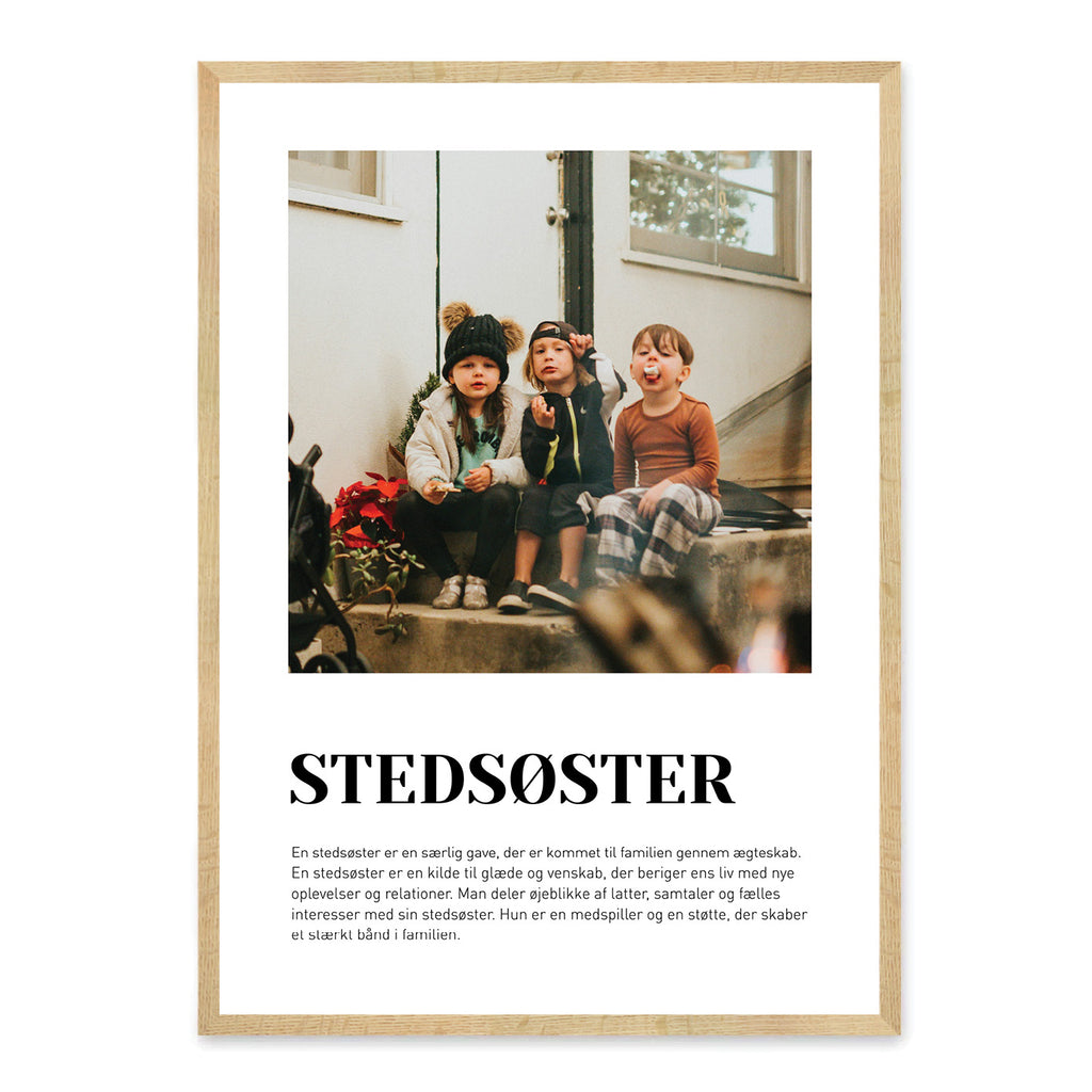 En Stedsøster-plakat er en kærlig måde at hylde den helt særlige relation, du har til din stedsøster. Den fremhæver de minder, grin og små øjeblikke af nærhed, der binder jer sammen som familie. Plakaten er en smuk måde at vise, hvor meget hun betyder, og hvor stor en rolle hun spiller i dit liv.