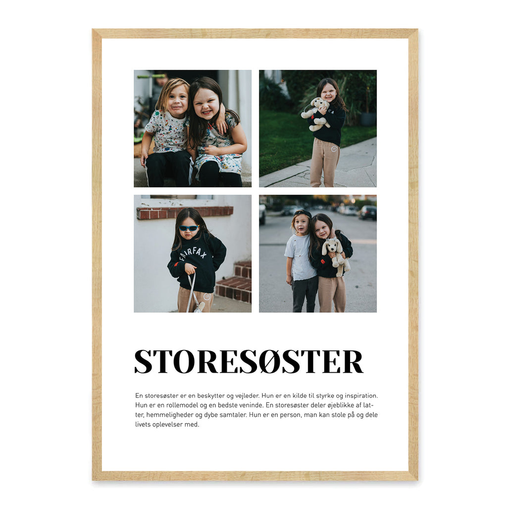 En Storesøster-plakat er en smuk hyldest til det særlige bånd mellem søskende. Den fejrer omsorg, kærlighed og de minder, I deler – og minder om, hvor vigtig hun er i dit liv. Gør plakaten personlig ved at vælge en færdig tekst eller skrive din egen, og upload ét eller fire billeder, som indfanger jeres bedste øjeblikke sammen.