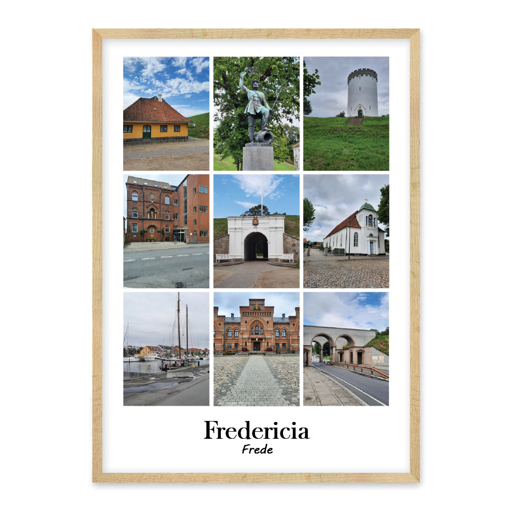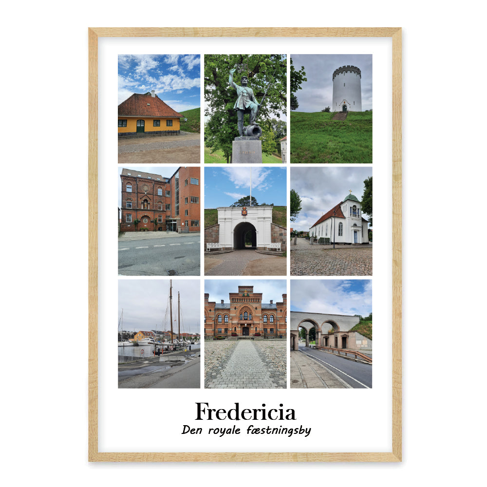 Her ser du en smuk Fredericia plakat med 9 fotografier med populære vartegn fra Fredericia. Den fine plakaten er udarbejdet i kulørte farver, og med masser af charme.
