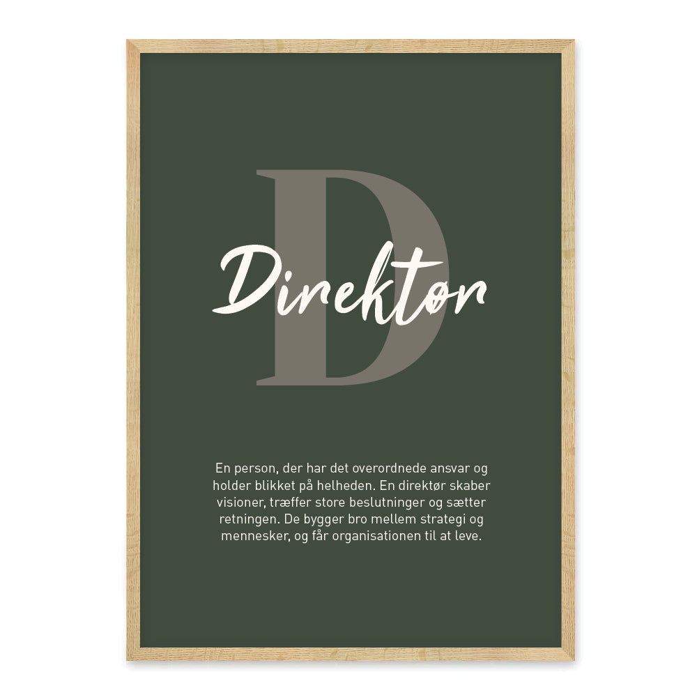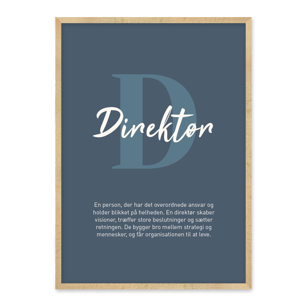 En stilren definitionsplakat med ordet Direktør og tilhørende definition. Plakaten er designet i et minimalistisk udtryk, der gør den til en dekorativ og meningsfuld detalje i kontoret, mødelokalet eller hjemmearbejdspladsen.