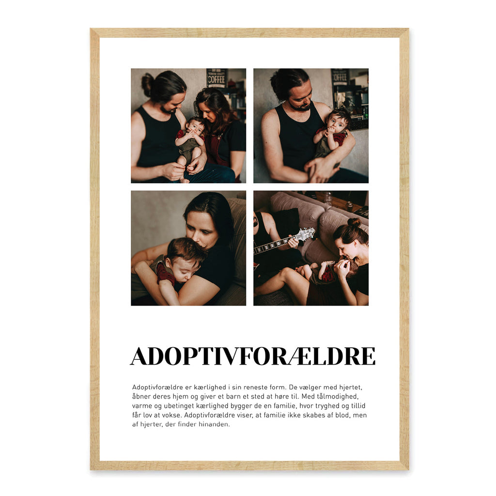 Fejr kærligheden og det særlige bånd i en familie med adoptivforældre. Denne smukke plakat kan gøres personlig med egne billeder og tekst, så den afspejler jeres unikke familiehistorie og den omsorg, der skaber stærke bånd.