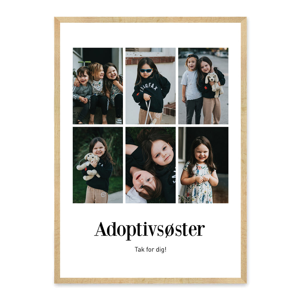Denne plakat er skabt som en varm hyldest til den særlige relation mellem adoptivsøstre – et bånd, der vokser gennem delte oplevelser, tålmodighed, grin og små øjeblikke, der former en følelse af “vi to hører sammen”. Hendes plads i dit liv er aldrig tilfældig, men skabt af valg, kærlighed og nærvær. Plakaten kan designes med 6 eller 9 billeder, en valgfri titel og personlig tekst, så den indrammer netop jeres historie.