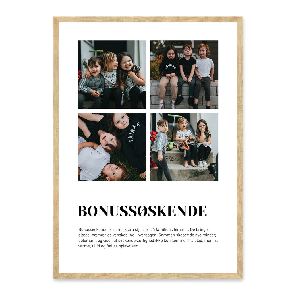 Fejr kærligheden og fællesskabet mellem bonussøskende med denne smukke plakat. Gør den personlig med egne billeder og tekst, så den afspejler minder, nærvær og de gode stunder, I deler sammen.