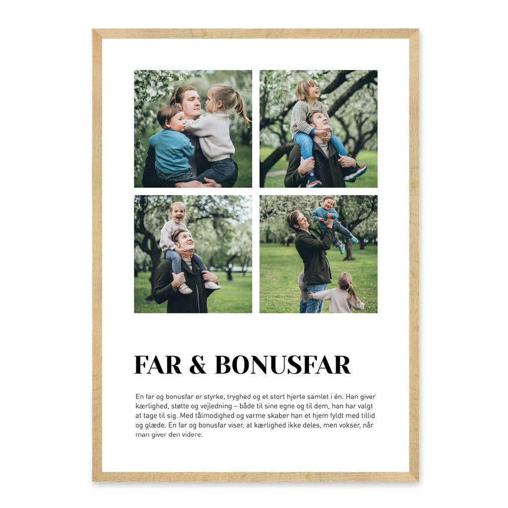 Fejr kærligheden og det særlige bånd til både far og bonusfar med denne smukke plakat. Gør den personlig med egne billeder og tekst, så den afspejler minder, nærvær og de gode stunder, I deler sammen.