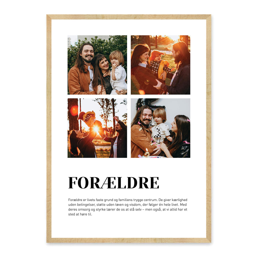 Fejr kærligheden og det særlige bånd til dine forældre med denne smukke plakat. Gør den personlig med egne billeder og tekst, så den afspejler minder, nærvær og de gode stunder, I deler sammen.