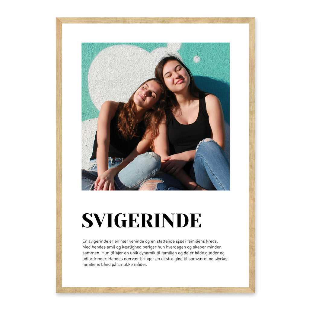 En Svigerinde-plakat er en kærlig måde at hylde den helt særlige relation, du har til din svigerinde – uanset om I er blevet familie gennem ægteskab eller først har fundet hinanden senere. Den fremhæver de minder, grin og små øjeblikke af nærhed, der binder jer sammen som familie. Plakaten er en smuk måde at vise, hvor meget hun betyder, og hvor stor en rolle hun spiller i dit liv.