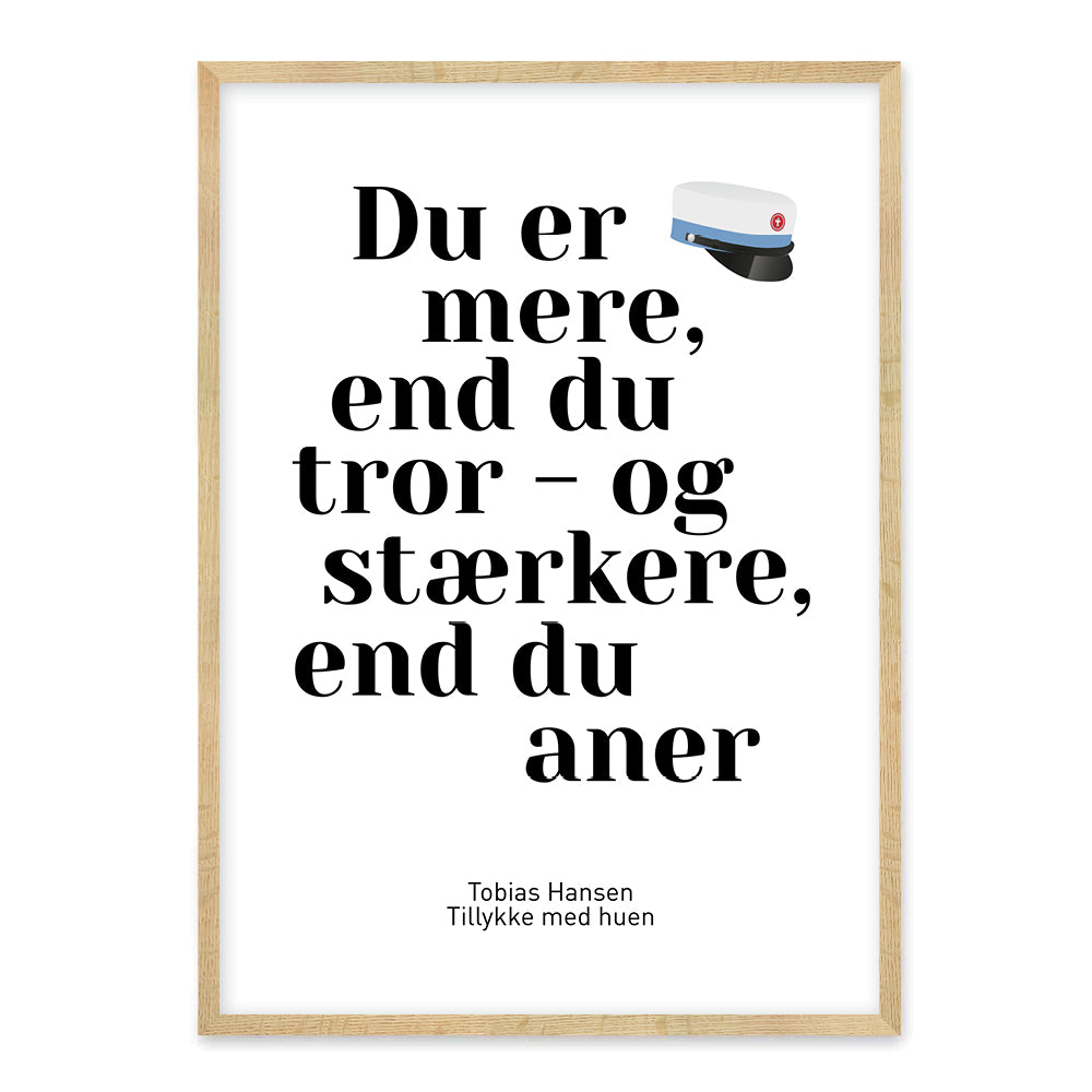 Der er både en tekst plakat, men også en hue plakat, som kan personliggøres. På hue plakaten kan du indsætte navn og årstal under huen, så man altid kan se tilbage på året, hvor man fik den længe ventede hue på. Vi har et bredt udvalg af de forskellige farver, og håber også vi kan hjælpe dig med, at finde et produkt med lige den hue, som du skal bruge. Sammen med en personlig gave hører også et kort. Dette kan du også købe hos os, i forskellige designs og farver.