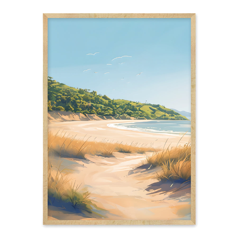 Plakat med en sandsti flankeret af gyldne sivplanter, der fører ned til stranden. Her møder man det blå vand og klitter med grønne træer. Over landskabet breder himlen sig i klar blå, hvor hvide fugle flyver rundt. Et lyst og roligt motiv, der indfanger strandens friske og naturlige stemning.