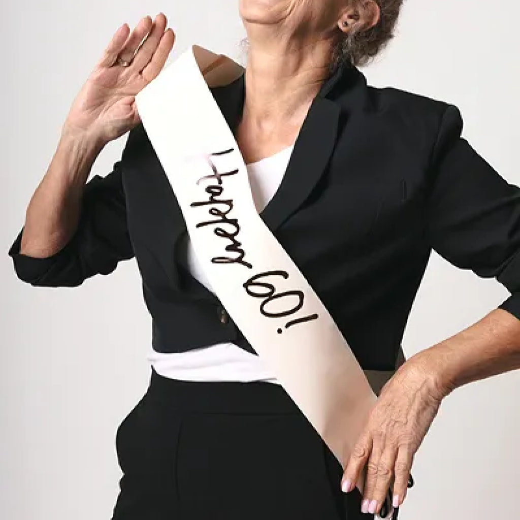 Elegant "Happy 60" skulderbånd i cremet papir med sort tryk – perfekt til 60-års fødselsdagsfejringen. Båndet måler ca. 9,5 cm i bredden og 76 cm i længden. Der medfølger et sort bånd i fløjl til at binde skulderbåndet sammen.