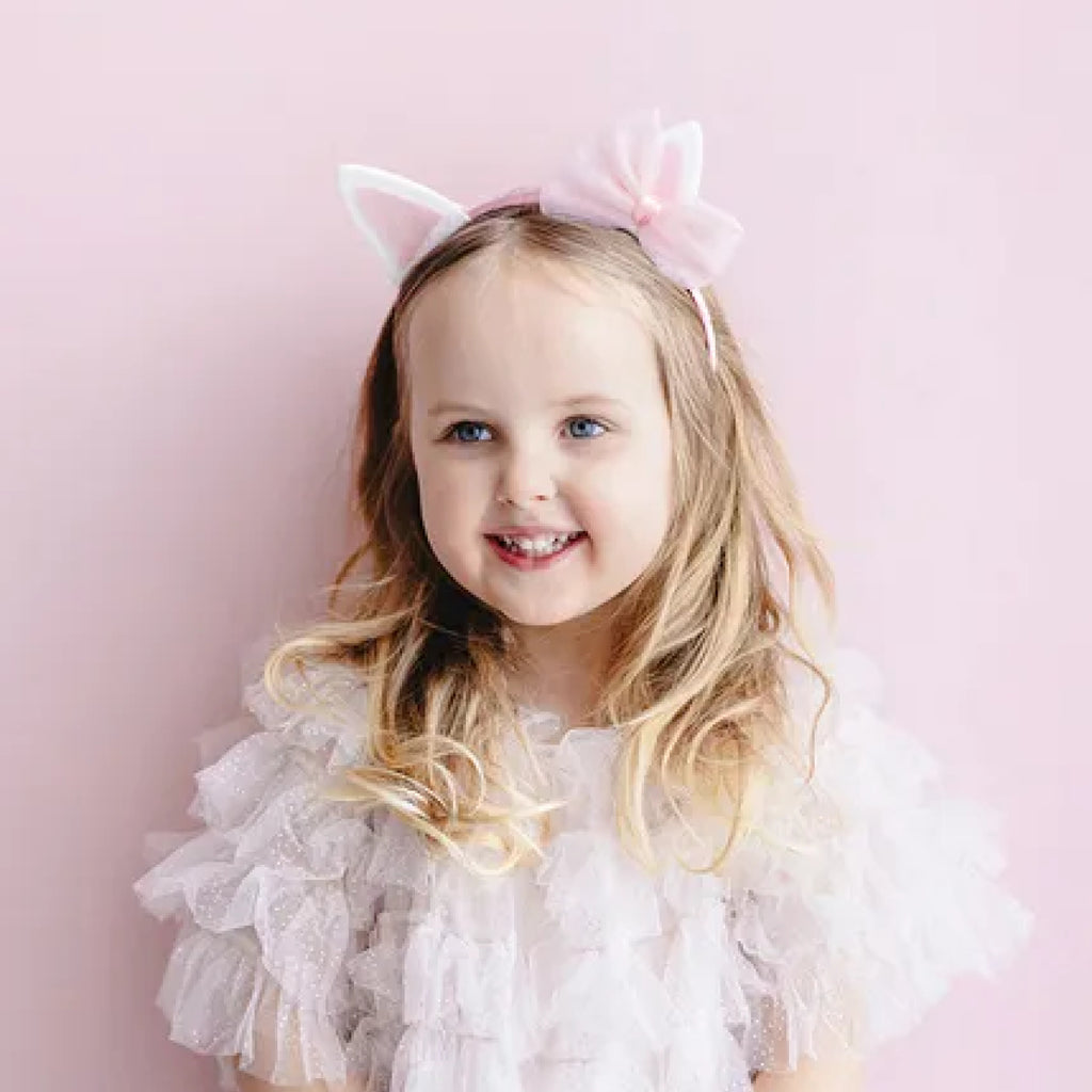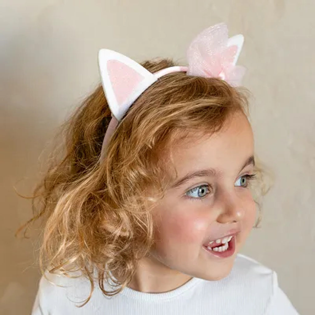 Sød hårbøjle med katteører og lyserød sløjfe – perfekt til udklædning, børnefødselsdage eller temafester. Tilføjer et charmerende og legende touch til ethvert outfit. Måler ca. 18,5 x 17 cm og passer de fleste børn.