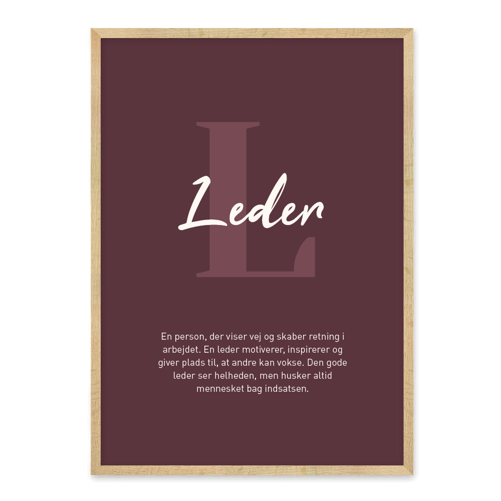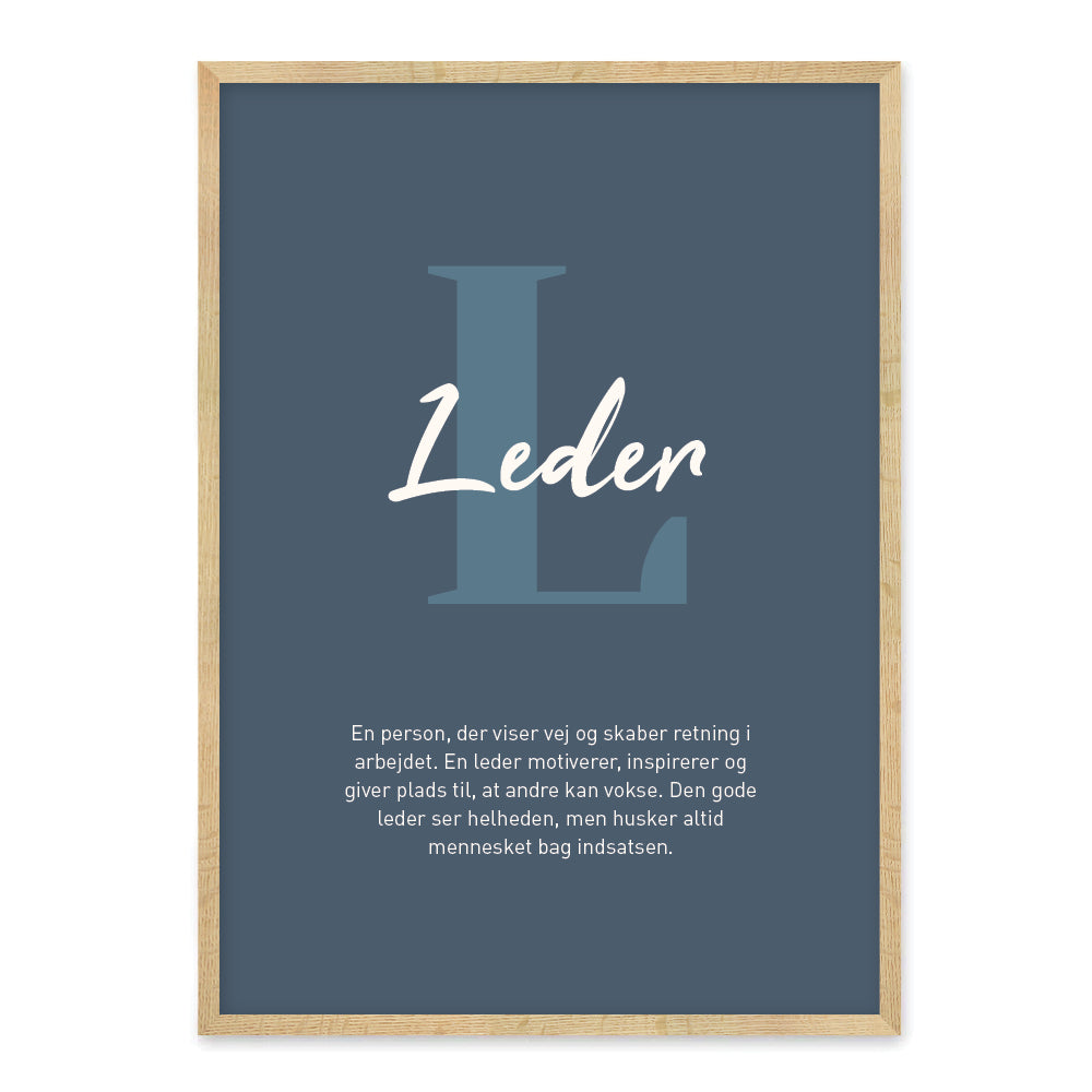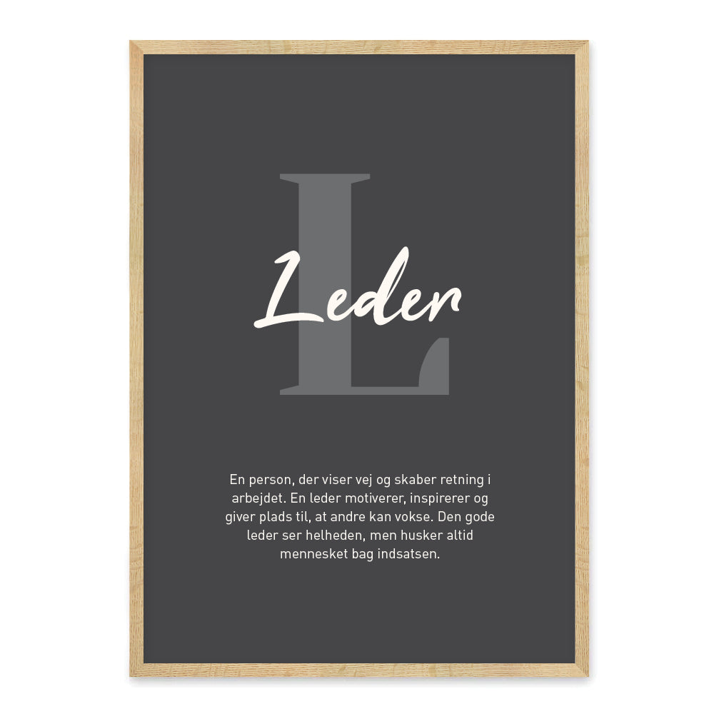 En stilren definitionsplakat med ordet Leder og tilhørende definition. Plakaten kombinerer et minimalistisk design med et meningsfuldt budskab, der passer perfekt til både kontoret og hjemmet.