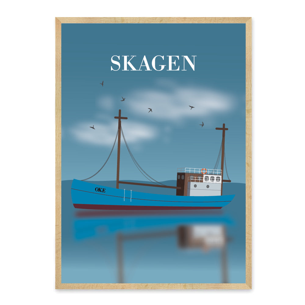 Dekorativ plakat af en blå båd med rød bund og brune master foran et hus i både brune og hvide nuancer med mørkegrå vinduer. Over motivet ses en blågrå himmel med hvide skyer og fugle i flugt. Øverst står teksten SKAGEN, som giver plakaten et maritimt udtryk med tydelig reference til den kendte kystby.