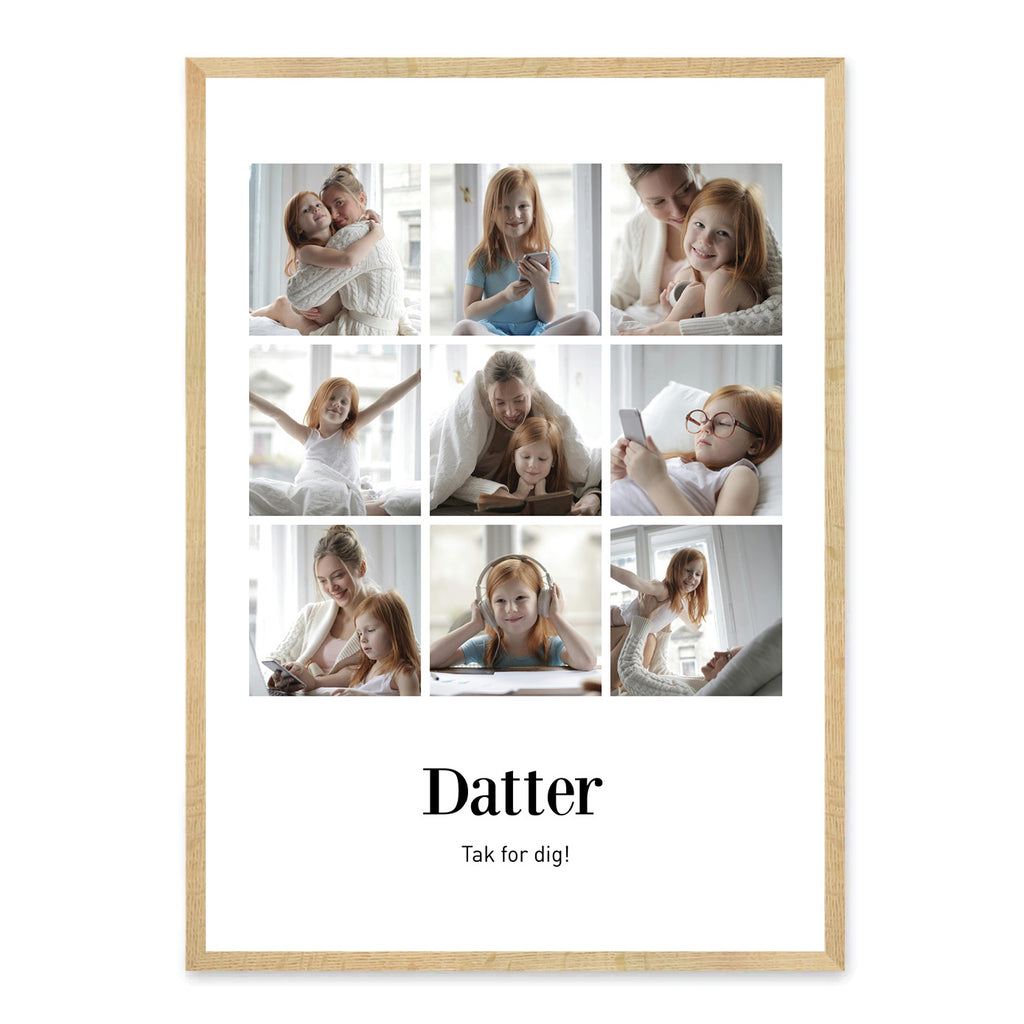 Et kærligt minde til din datter, der fejrer hendes personlighed, styrke og de små øjeblikke, der gør jeres forhold særligt. Denne plakat kan indfange latteren fra de sjove stunder, varme kram og de minder, I skaber sammen. Den kan tilpasses med dine egne 6 eller 9 billeder, en personlig overskrift og tekst, som fortæller hendes helt unikke historie og alt det, der gør hende til den vidunderlige person, hun er.