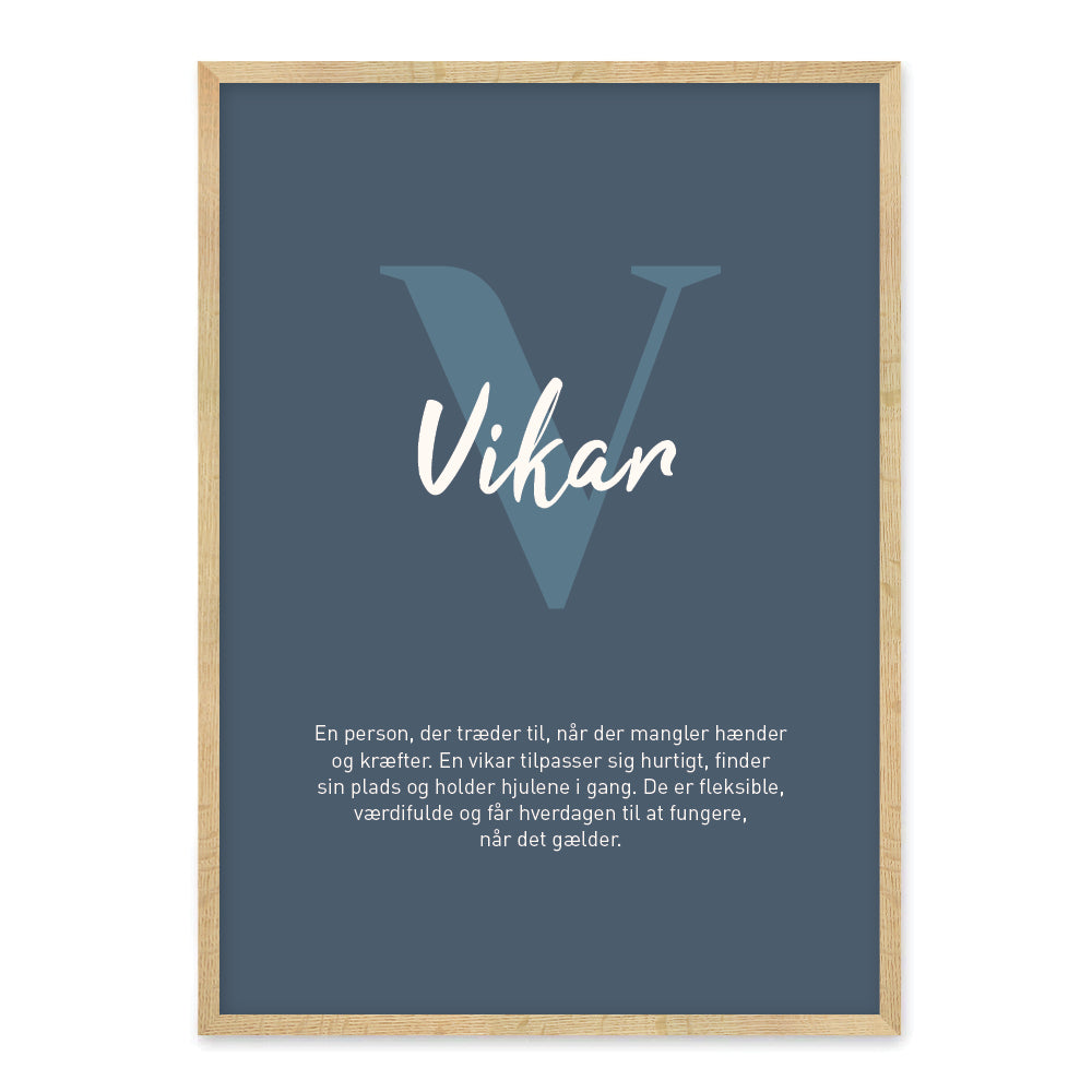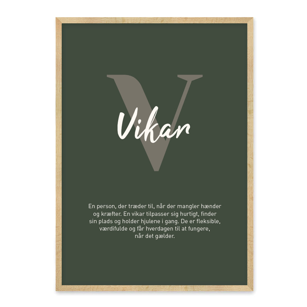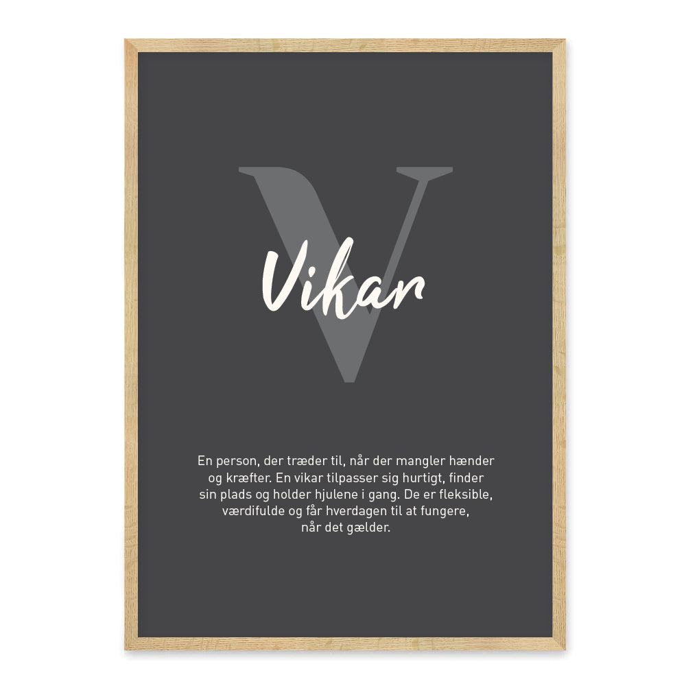 En stilren definitionsplakat med ordet Vikar og tilhørende definition. Plakatens minimalistiske design gør den til en dekorativ og humoristisk detalje i både hjemmet og på arbejdspladsen.