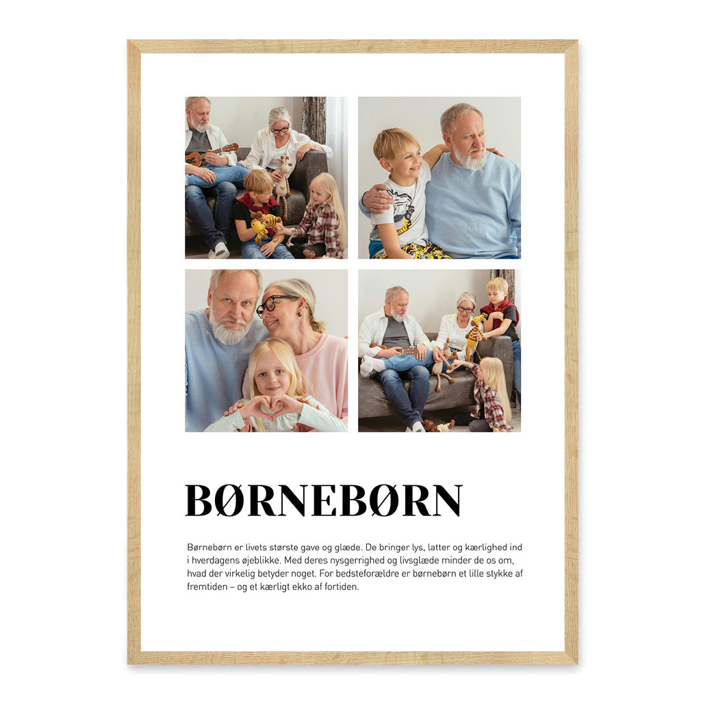 Vælg mellem et design med ét eller fire billeder, og tilføj en færdig tekst fra vores liste – eller skriv din egen. En rørende og betydningsfuld gaveidé til bedsteforældre, der vil værdsætte en personlig hyldest til deres børnebørn.