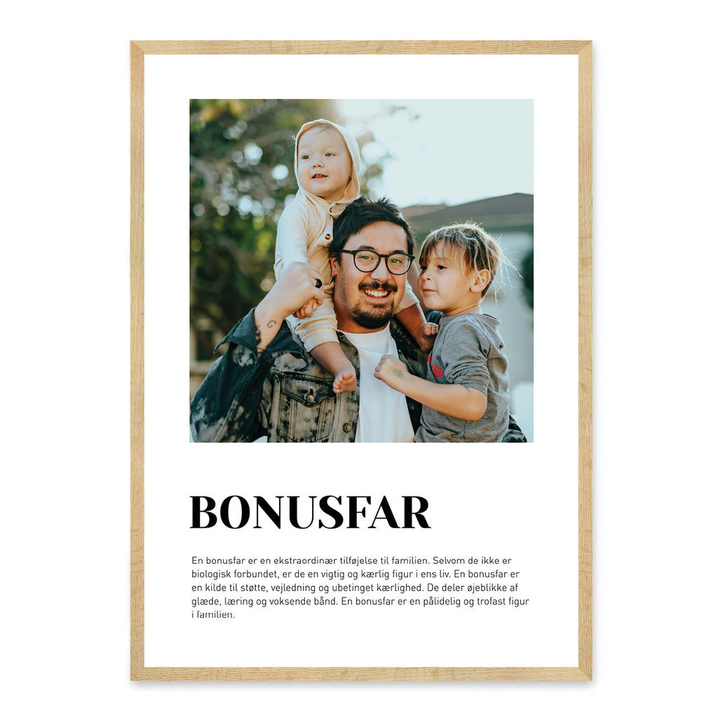 Plakaten kan personliggøres med ét eller fire billeder, så den afspejler netop jeres fælles minder. Du kan vælge en færdig tekst eller skrive din egen for at gøre gaven ekstra personlig. Den er oplagt som gave til fødselsdag, fars dag, jul eller som en varm og uventet overraskelse, der viser, hvor meget din bonusfar betyder for dig. Det enkle og moderne design gør den perfekt til både stue, kontor eller soveværelse – et varigt minde om et helt særligt bånd.
