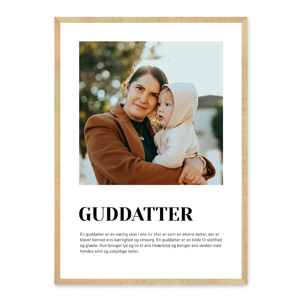 En Guddatter-plakat er en smuk måde at hylde det særlige bånd, du har til din guddatter. Den indfanger de små øjeblikke, grin og nærvær, som har formet jeres relation – fra de første skridt i livet til de stunder, hvor du har fulgt hende og støttet hende på hendes vej. Plakaten viser, hvor meget hun betyder for dig, og fejrer hendes unikke plads i dit hjerte.
