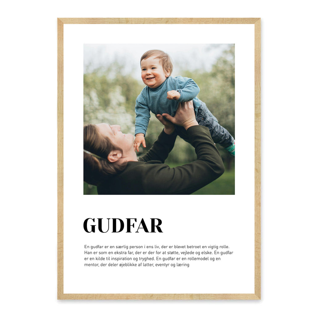 En Gudfar-plakat er en rørende måde at hylde den mand, der har en helt særlig plads i dit liv. Den indfanger de minder, smil og øjeblikke af nærvær, som har formet jeres relation – fra de store stunder, hvor han stod ved din side, til de små, hjertevarme øjeblikke, der betyder allermest. Plakaten viser, hvor meget hans støtte, visdom og kærlighed betyder, og fejrer den rolle, han spiller som en ekstra vigtig person i familien.