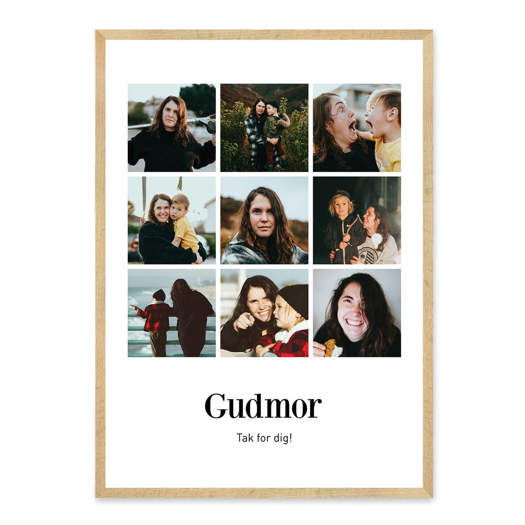 En kærlig og personlig plakat til din gudmor, der hylder alt det, hun har gjort for dig – fra de små kærlige gestus til de store øjeblikke fyldt med støtte, varme og nærvær. Hun har været en helt særlig del af dit liv, og denne plakat er en smuk måde at sige tak på. Plakaten kan designes med dine egne 6 eller 9 billeder, en personlig overskrift og tekst, så den bliver et minde fyldt med følelser og betydning.
