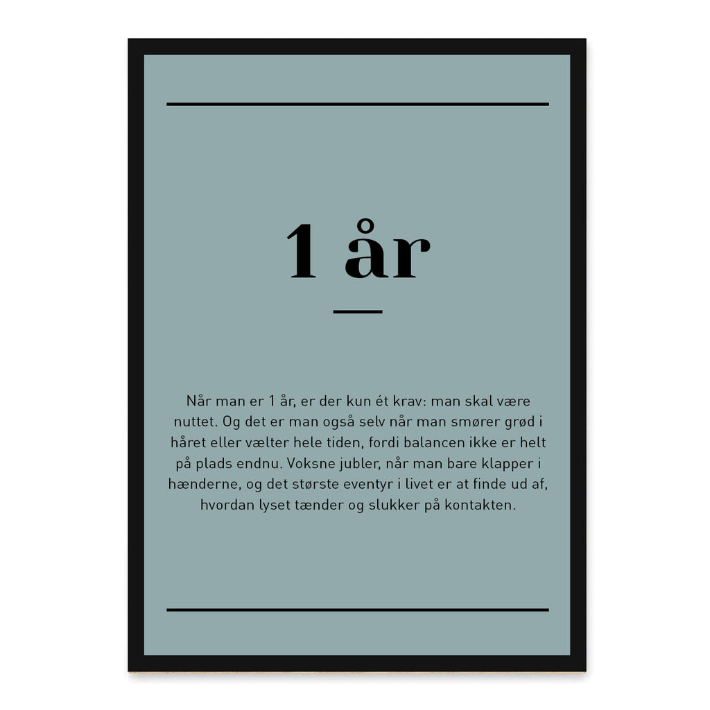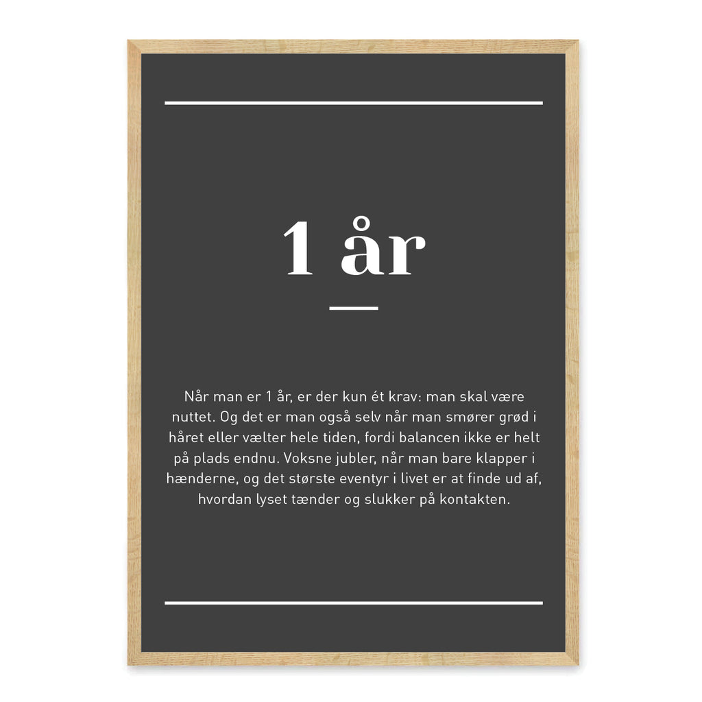 Fejr den lille med et smil. Denne søde og sjove “1 år” plakat beskriver på humoristisk vis, hvad det egentlig vil sige at være ét år gammel – med en definition, som får både forældre og gæster til at trække på smilebåndet.
