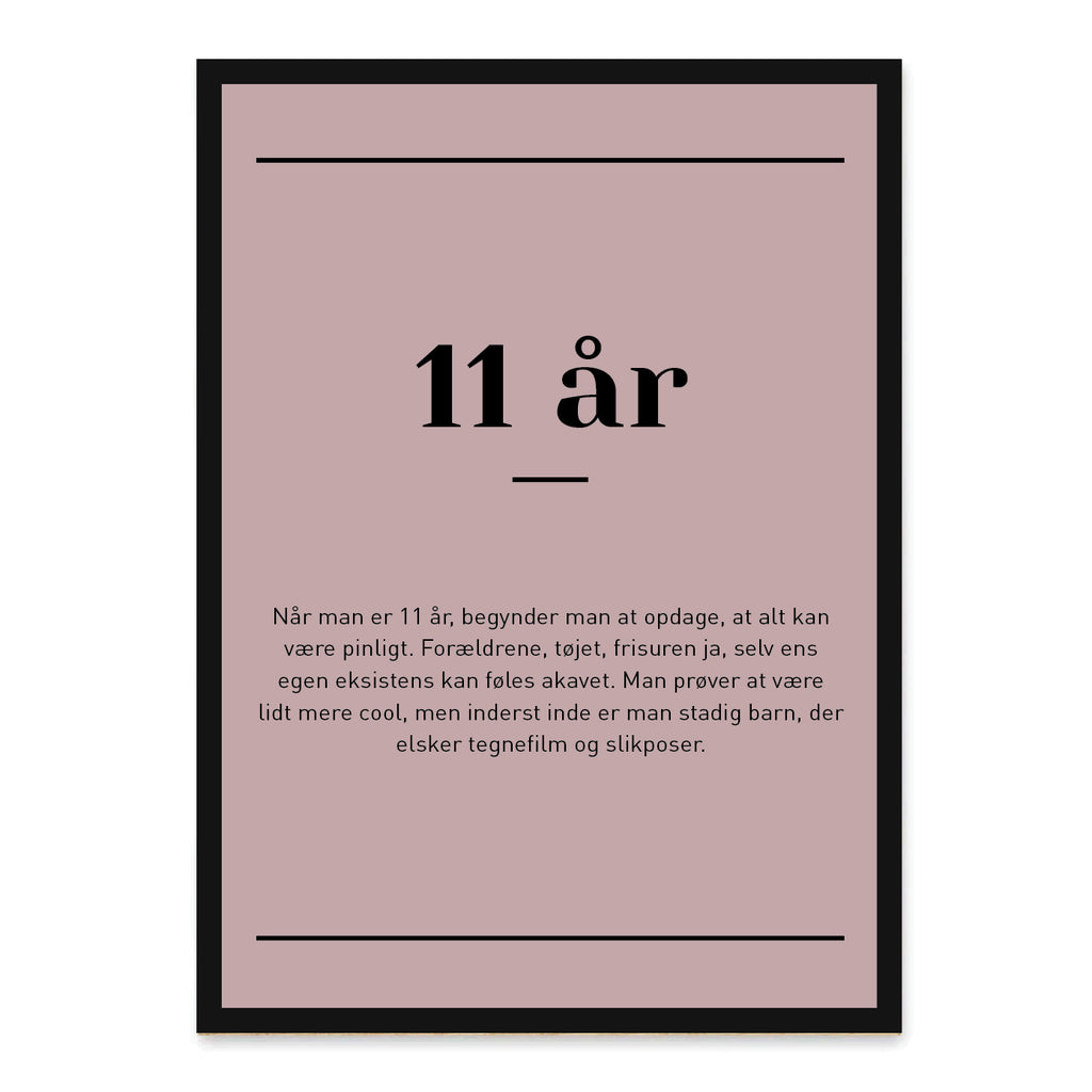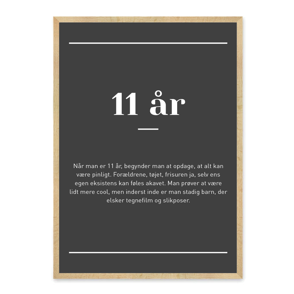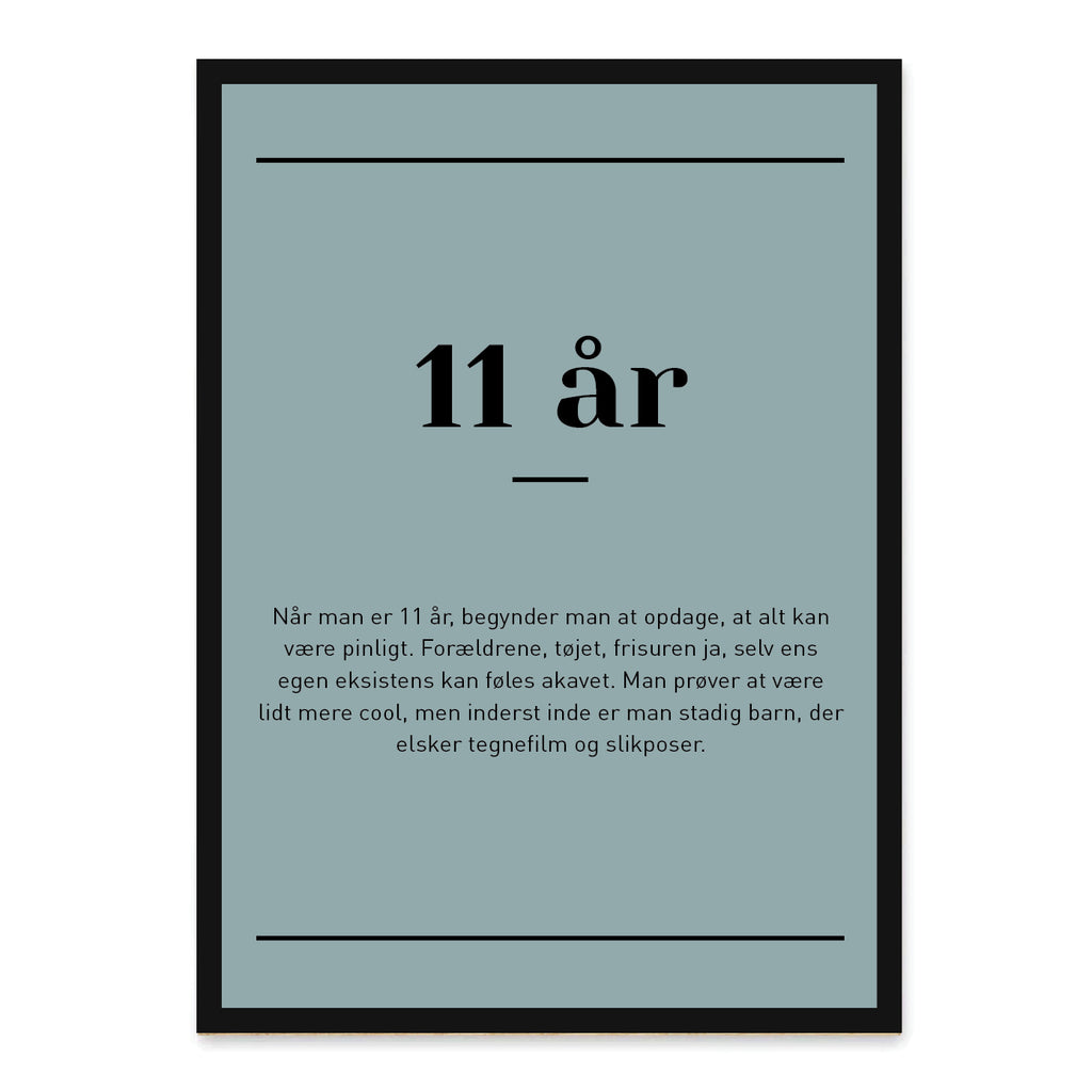 11 år er alderen, hvor barn og tween begynder at mødes – fyldt med nye tanker, selvstændighed og masser af følelser på højt blus. Denne plakat fanger det sjove og særlige ved at være 11 år med en humoristisk og kærlig beskrivelse, der rammer plet hos både børn og voksne.