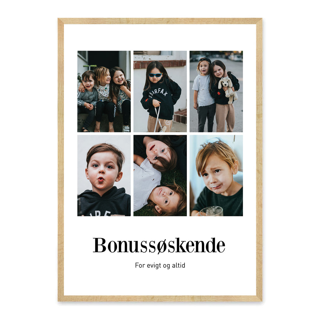 Bonussøskende kommer nogle gange ind i livet lidt senere, men relationen vokser hurtigt til noget helt særligt. I deler måske grin, interne jokes og nye traditioner, som efterhånden føles helt naturlige. Denne plakat hylder den familiefølelse, der opstår, når man vælger at høre sammen – uanset hvordan historien begyndte. Plakaten kan designes med 6 eller 9 billeder, en personlig titel og tekst, så den afspejler netop jeres fælles bånd.