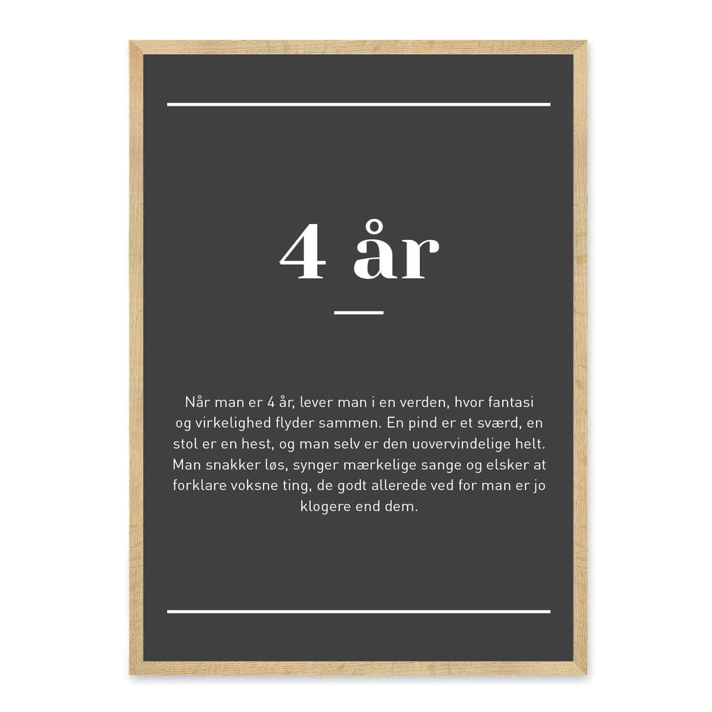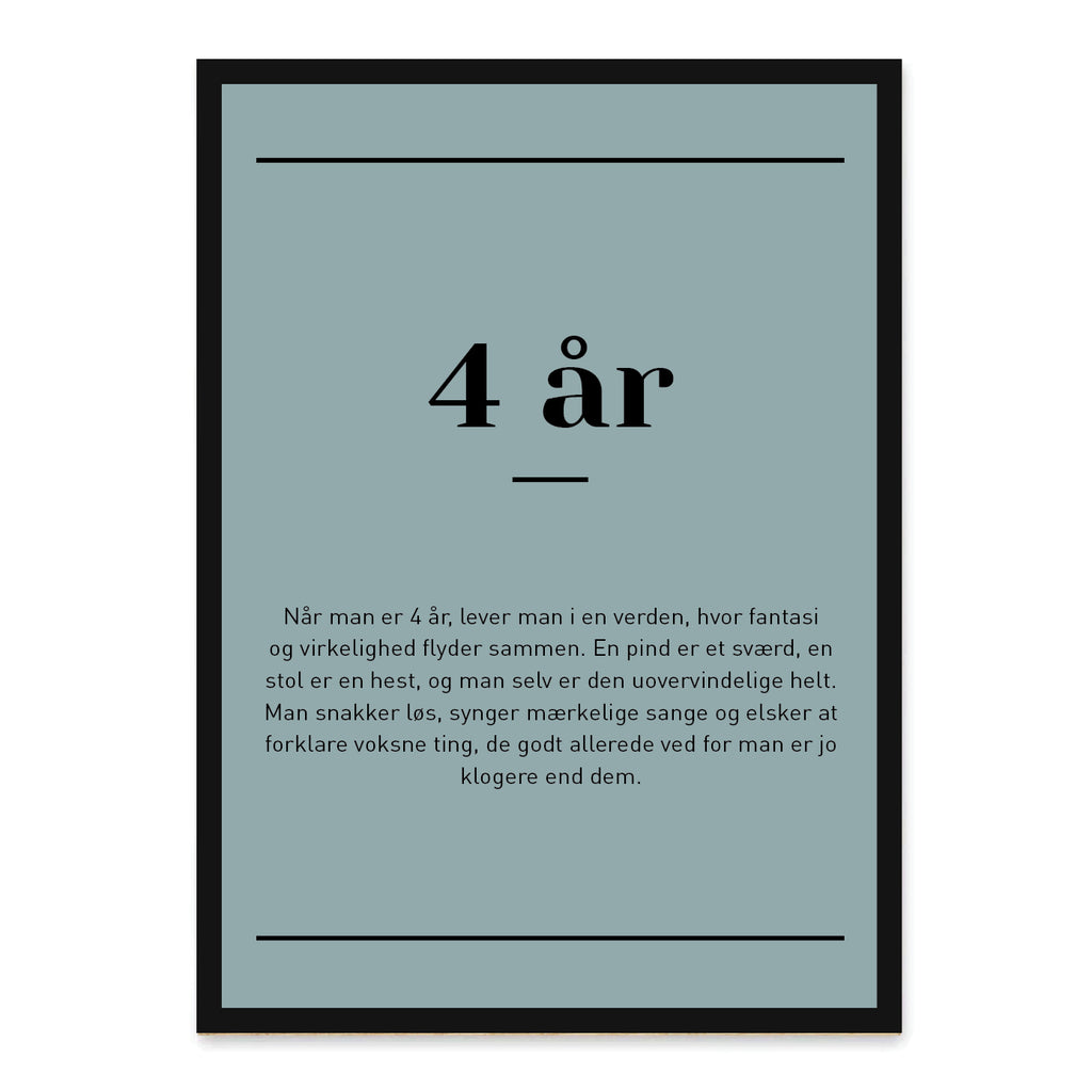 En oplagt gave til 4-års fødselsdagen eller som en hyggelig og personlig dekoration på børneværelset. Det enkle og moderne design gør plakaten nem at integrere i hjemmet – og den bringer smil og varme hver gang man læser den.