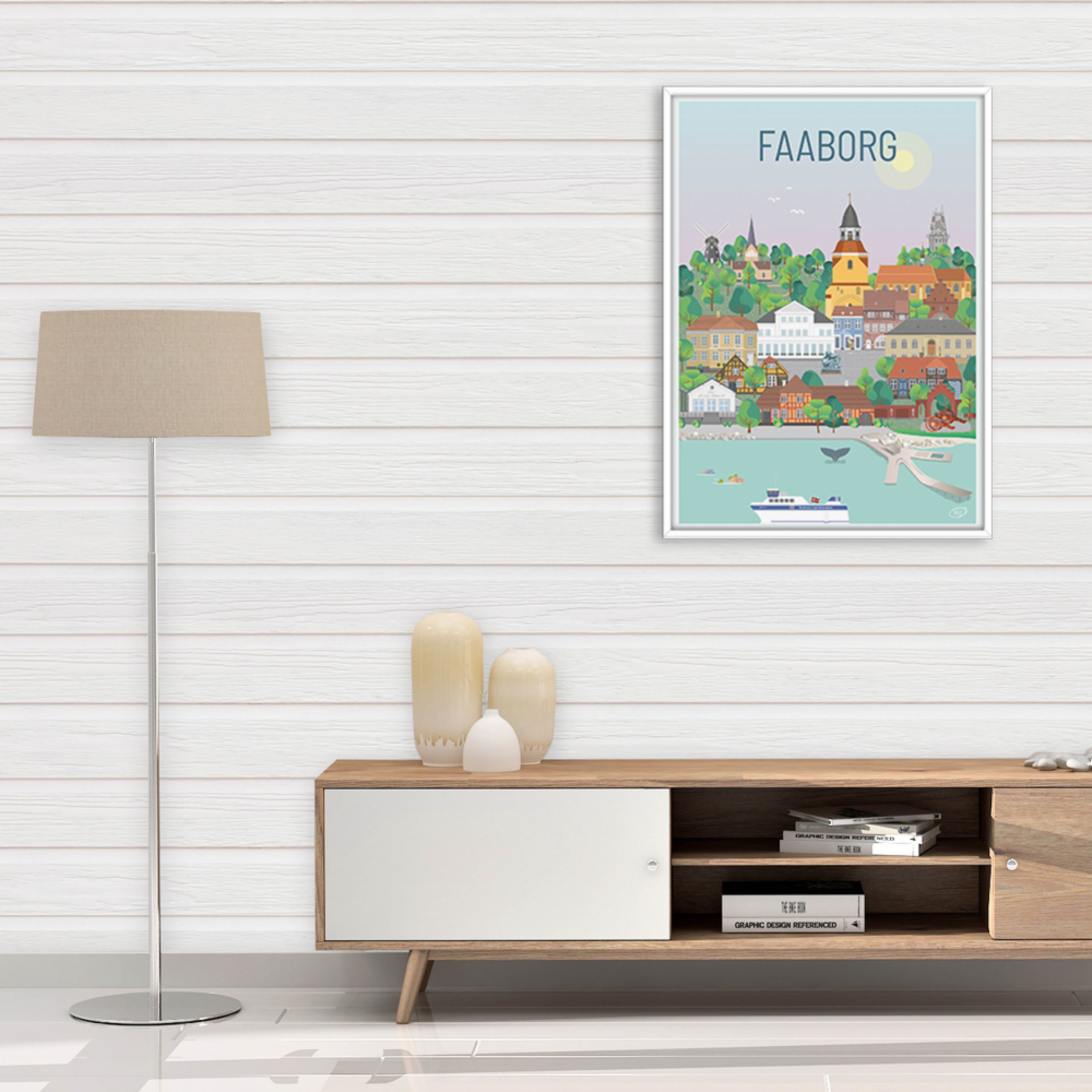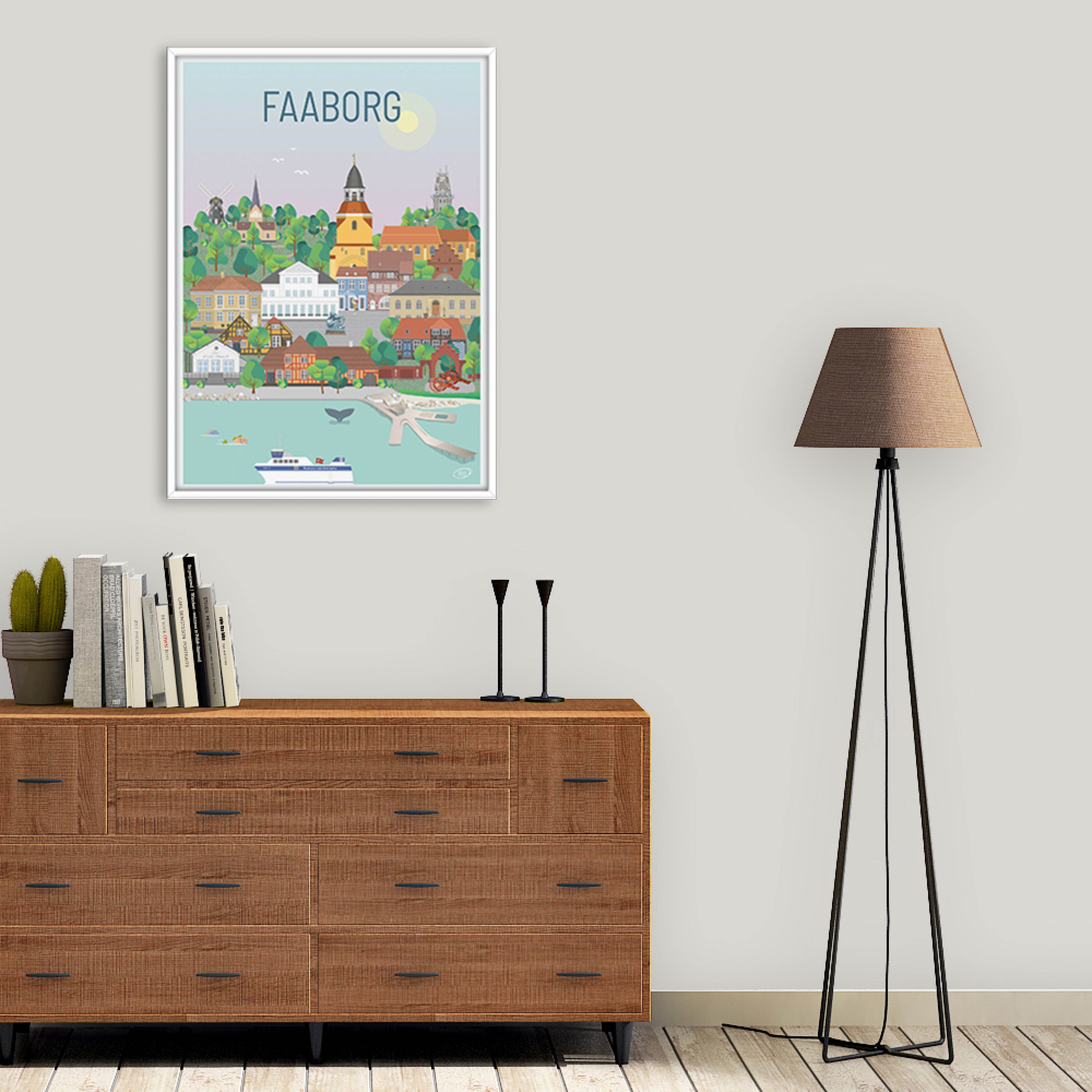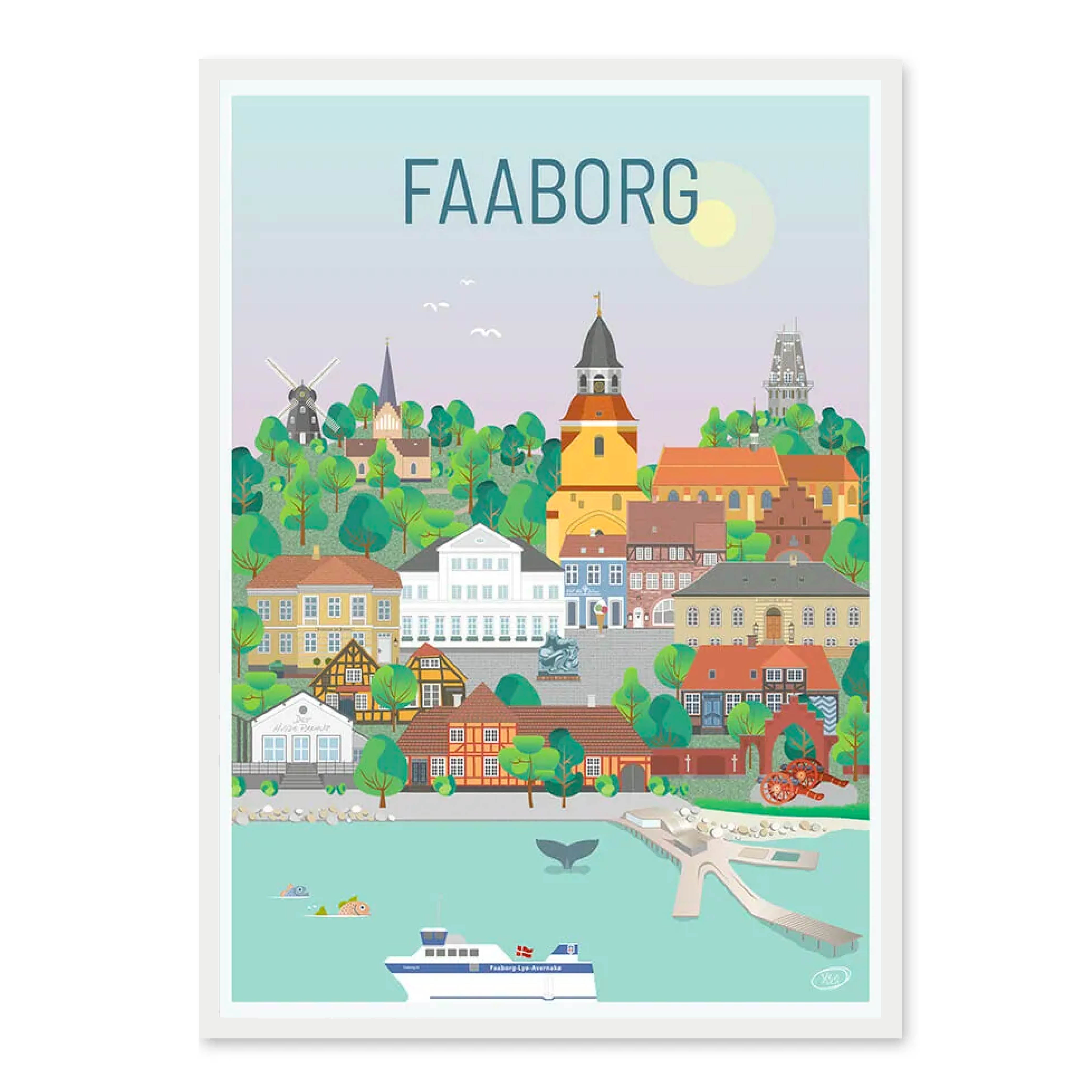 En smuk og detaljeret byplakat udarbejdet af Vilakula med motiv af skønne Faaborg. Fåborg har ca. 7000 indbyggere og er derfor en mindre sydfynsk by, med masser af historie og charme. Stokroseidyllen understreges så fint, når klokketårnet spiller 4 gange om dagen året rundt. Er du lokal eller måske turist, og ønsker en skøn farverig Faaborg byplakat med masser af detaljer, så kan du her vælge plakaten fra Vilakula.