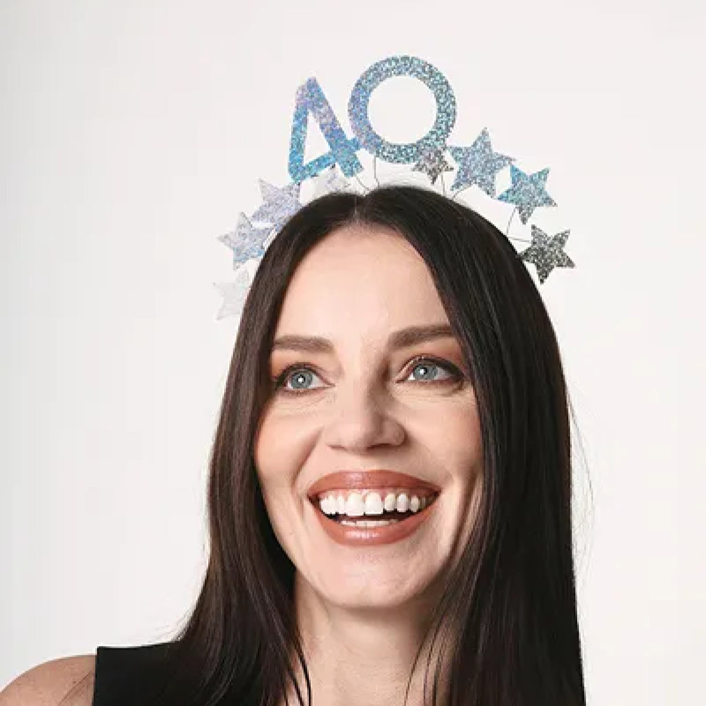 Festlig hårbøjle med 40 sølvfarvede stjerner – perfekt til 40-års fødselsdage, jubilæer eller temafester. Tilføjer et skinnende og sjovt element til dit festoutfit. Hårbøjlen måler ca. 22 x 21,5 cm og passer de fleste.