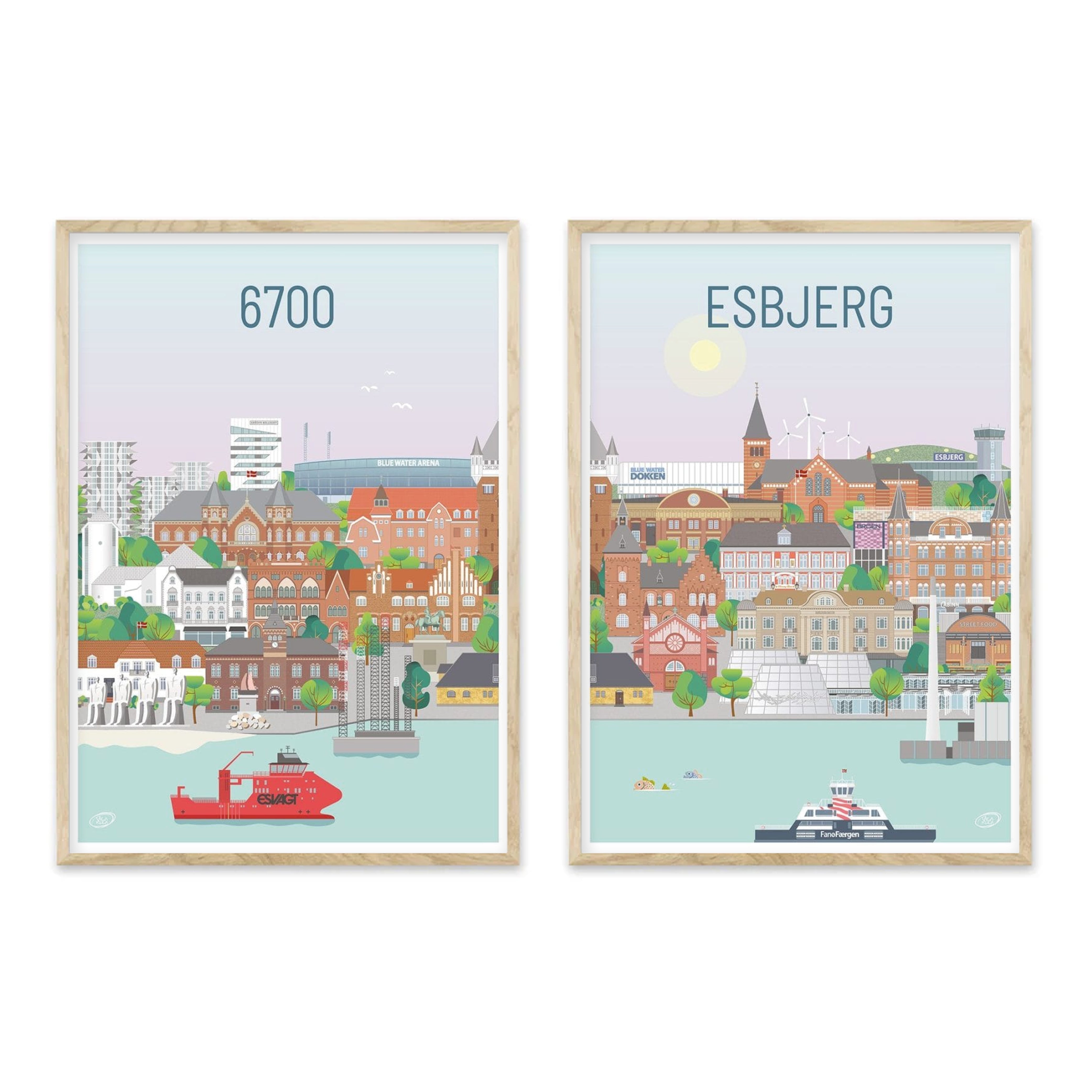 Her får du en sampak med to skønne Esbjerg plakater designet af Vilakula. Plakaterne er designet således at de passer smukt ved siden af hinanden, med bygninger der fortsætter ind i det næste billede.